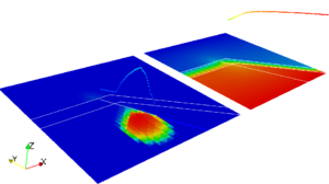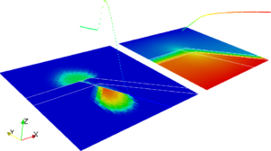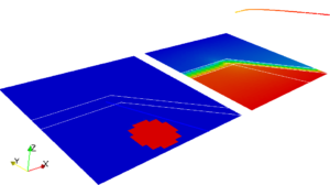 In each of the four images are reported the wetting phase saturation, in the bottom-left part, and global pressure, in the top-right part. Each figure report the solutions at different times, from left to right and from top to bottom. The fractures propagates with an imposed time law cutting the impermeable layer.